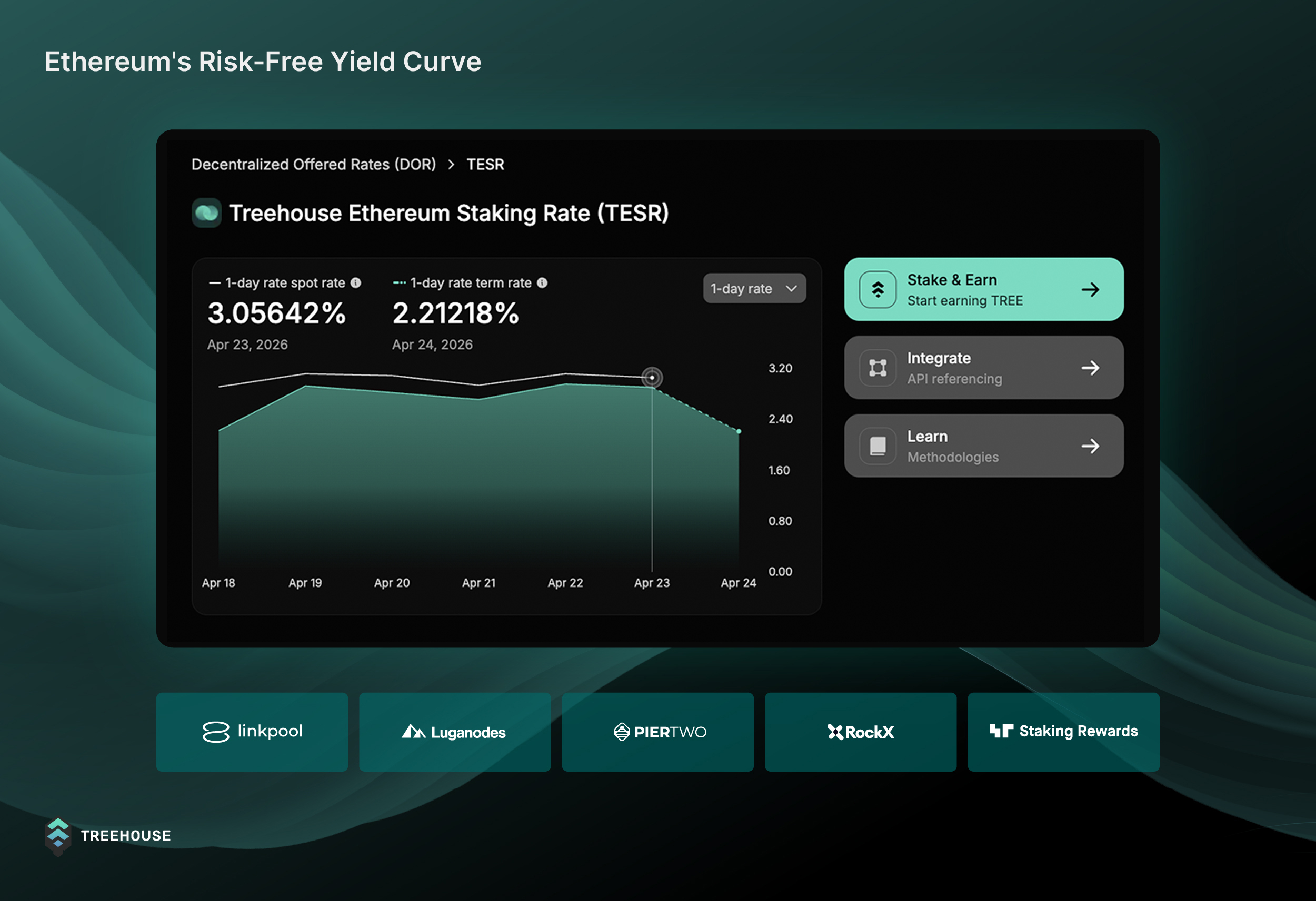 Stake TREE and earn daily rewards from a monthly pool of 300,000 TREE, while supporting the accuracy and reliability of Decentralized Offered Rates (DOR) — benchmark rates designed to enable fixed income markets in DeFi.