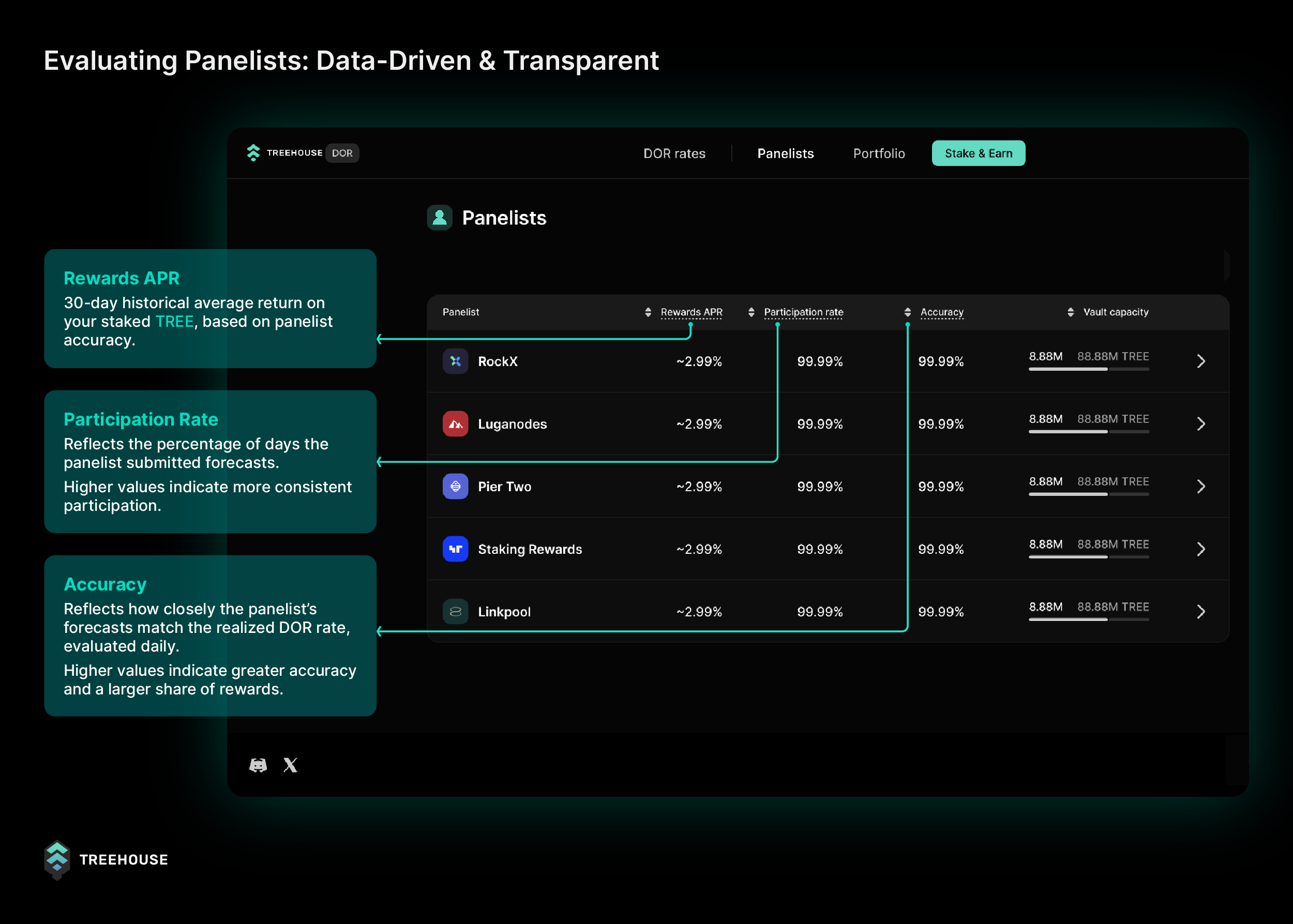 - Rewards APR: the 30-day historical average return on staked TREE, based on how well the panelist has performed