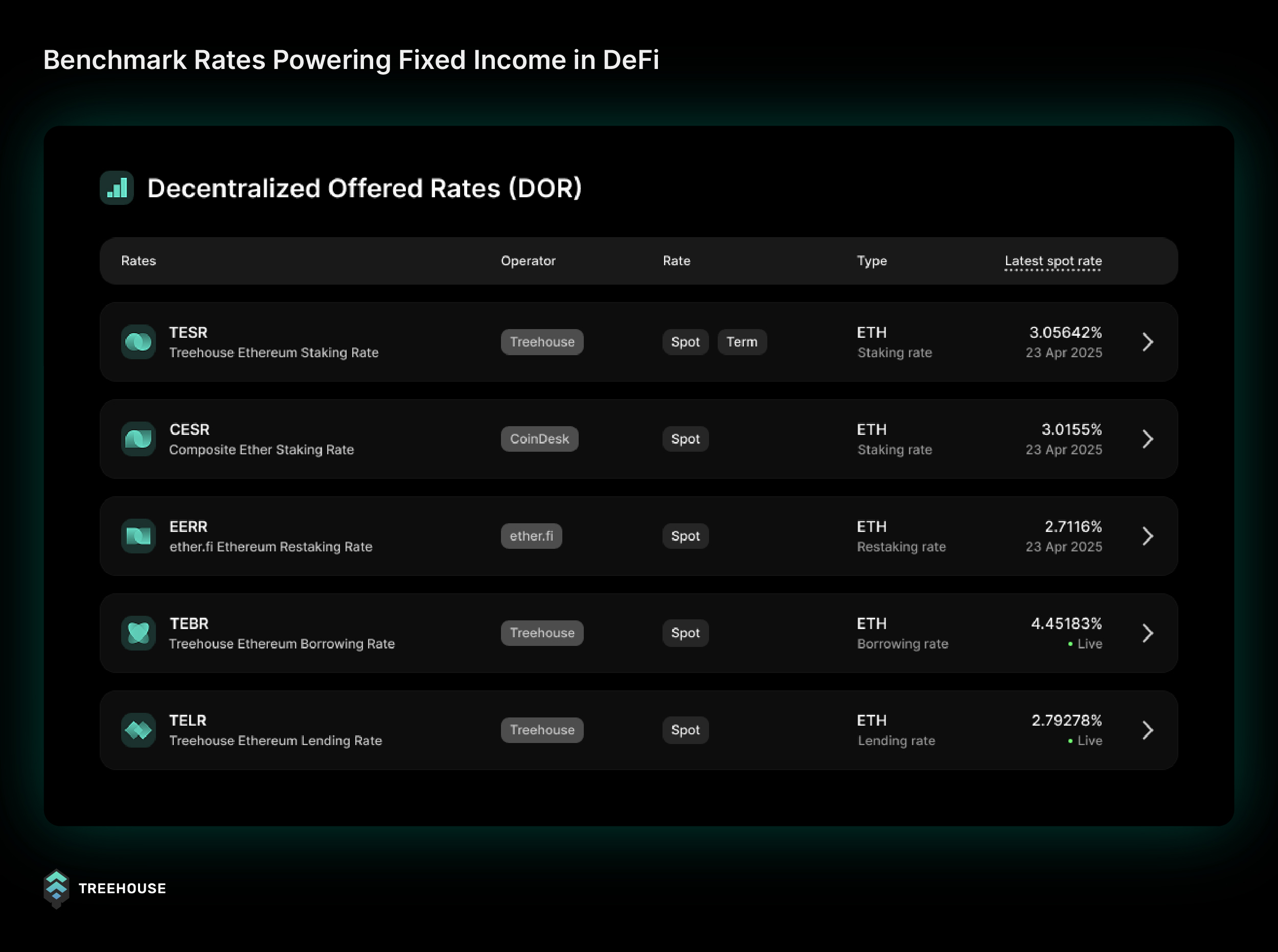 Treehouse Protocol is also pioneering the Decentralized Offered Rates (DOR) consensus mechanism for benchmark rate setting, enabling a range of fixed income products and primitives into digital assets. Treehouse is dedicated to creating safer and more predictable return alternatives for both individual investors and institutions.