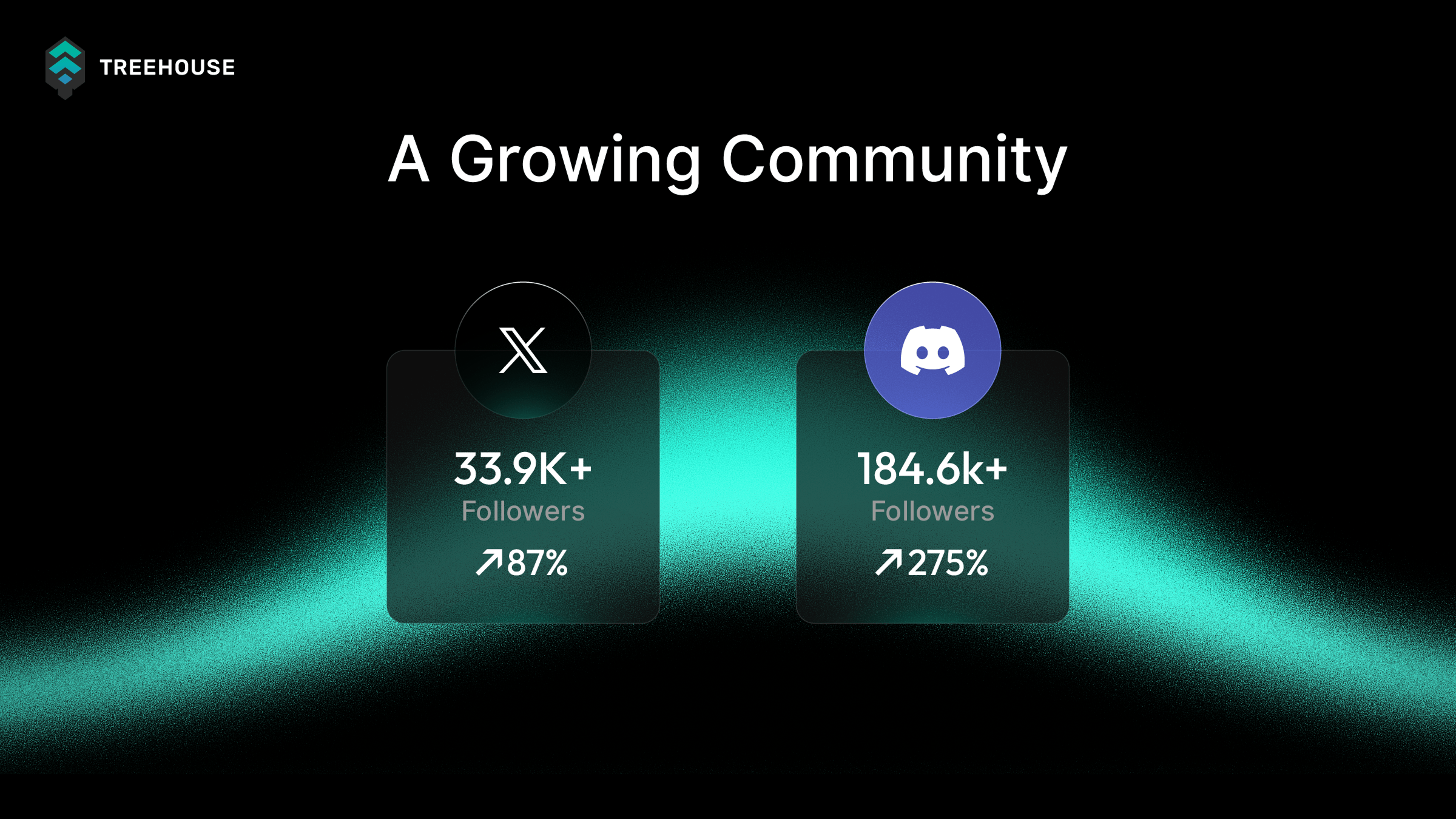 This commitment to transparency has fueled our growth, with Treehouse now boasting 184.6K+ followers on X and a vibrant Discord community of over 33,000 members.