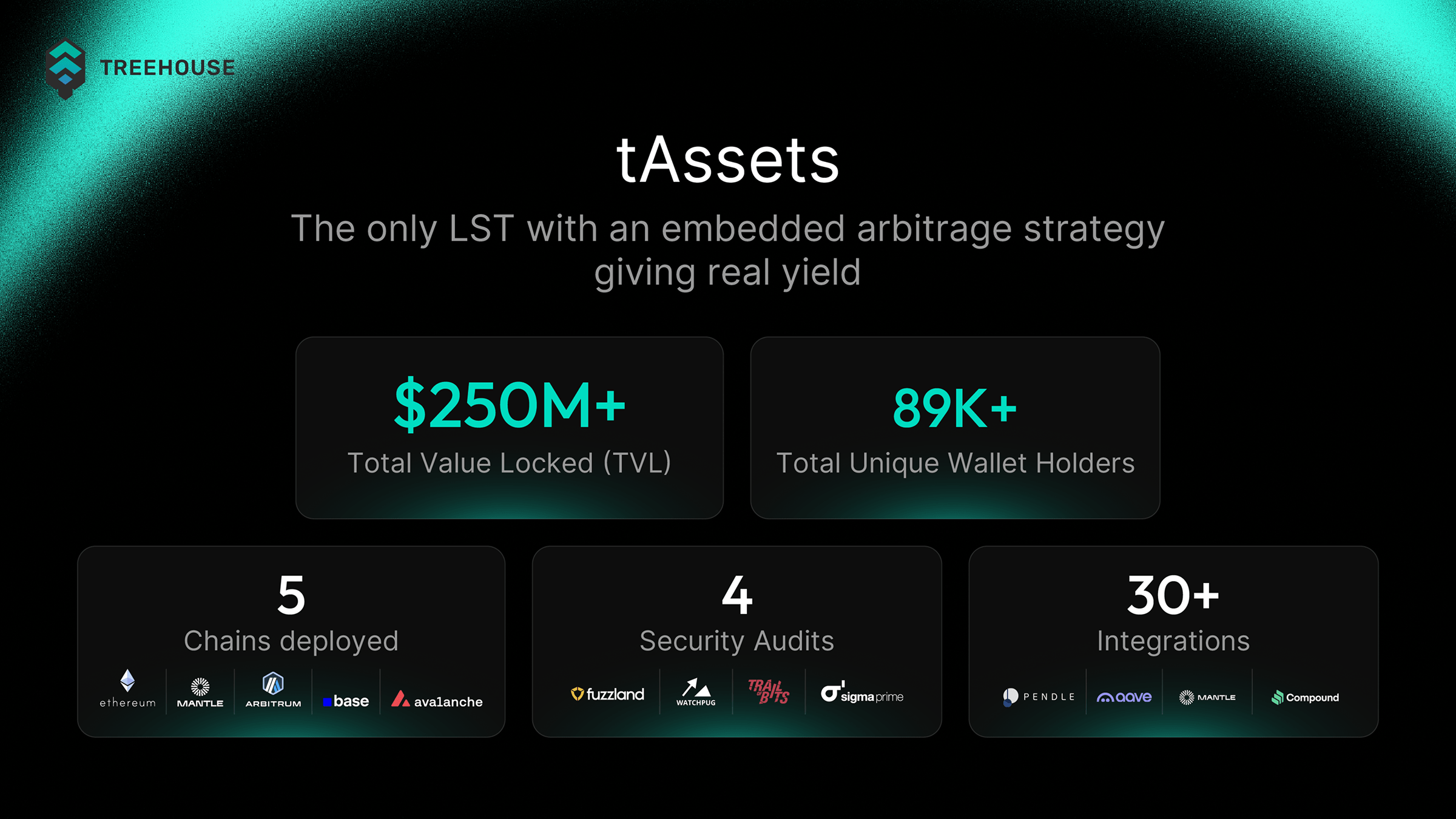 As of late 2025, Treehouse maintains over $250 million in Total Value Locked (TVL) and 89,300 unique holders. Following the multi-chain expansion strategy, flagship tAssets were deployed on Avalanche, Base, and Arbitrum to provide Market Efficiency Yield (MEY) across these networks.